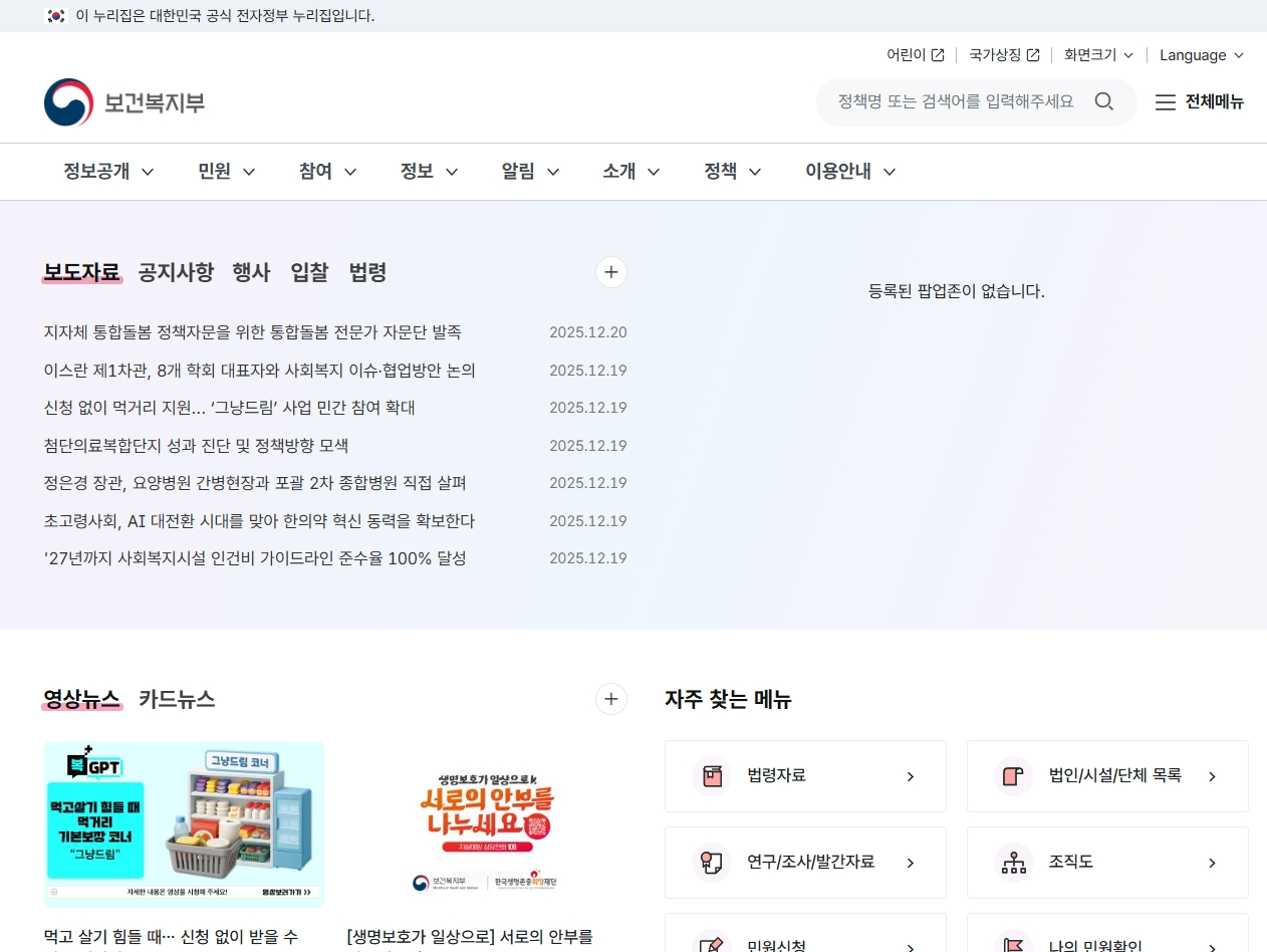 보건복지부 보도자료 "기본이 튼튼한 복지강국 국민 보두가 행복한 대한민국" 바로가기 ↗